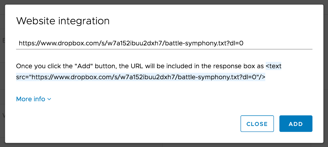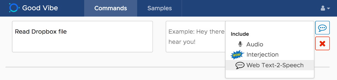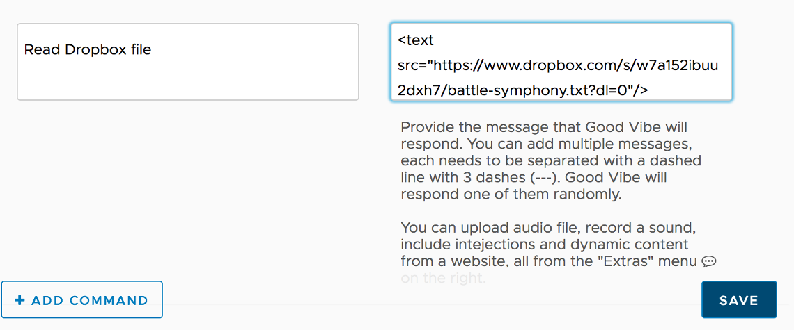 The web text-2-speech feature in Good Vibe allows you to link a command response to any web content, opening the doors to integrate with many 3rd party services. One of which can be Dropbox.