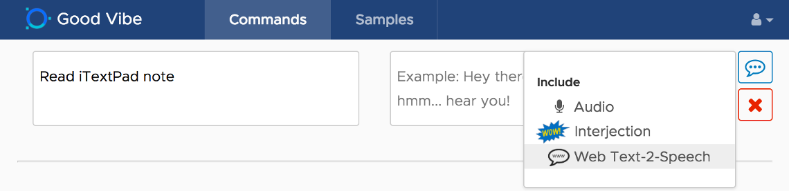 Now, let's create a command "Read iTextPad note". For the response part, we click on the extras menu and then on "Web Text-2-Speech".